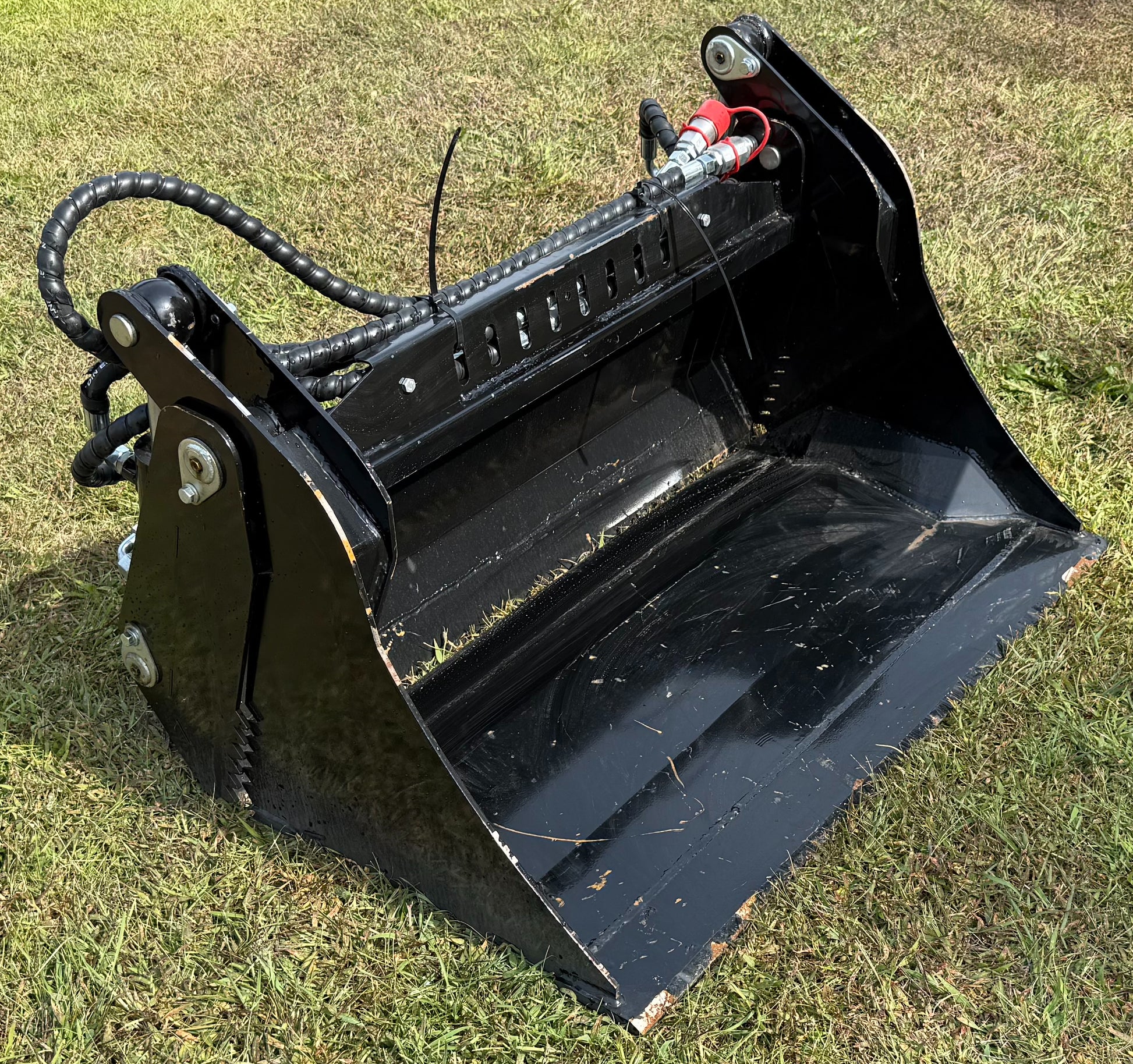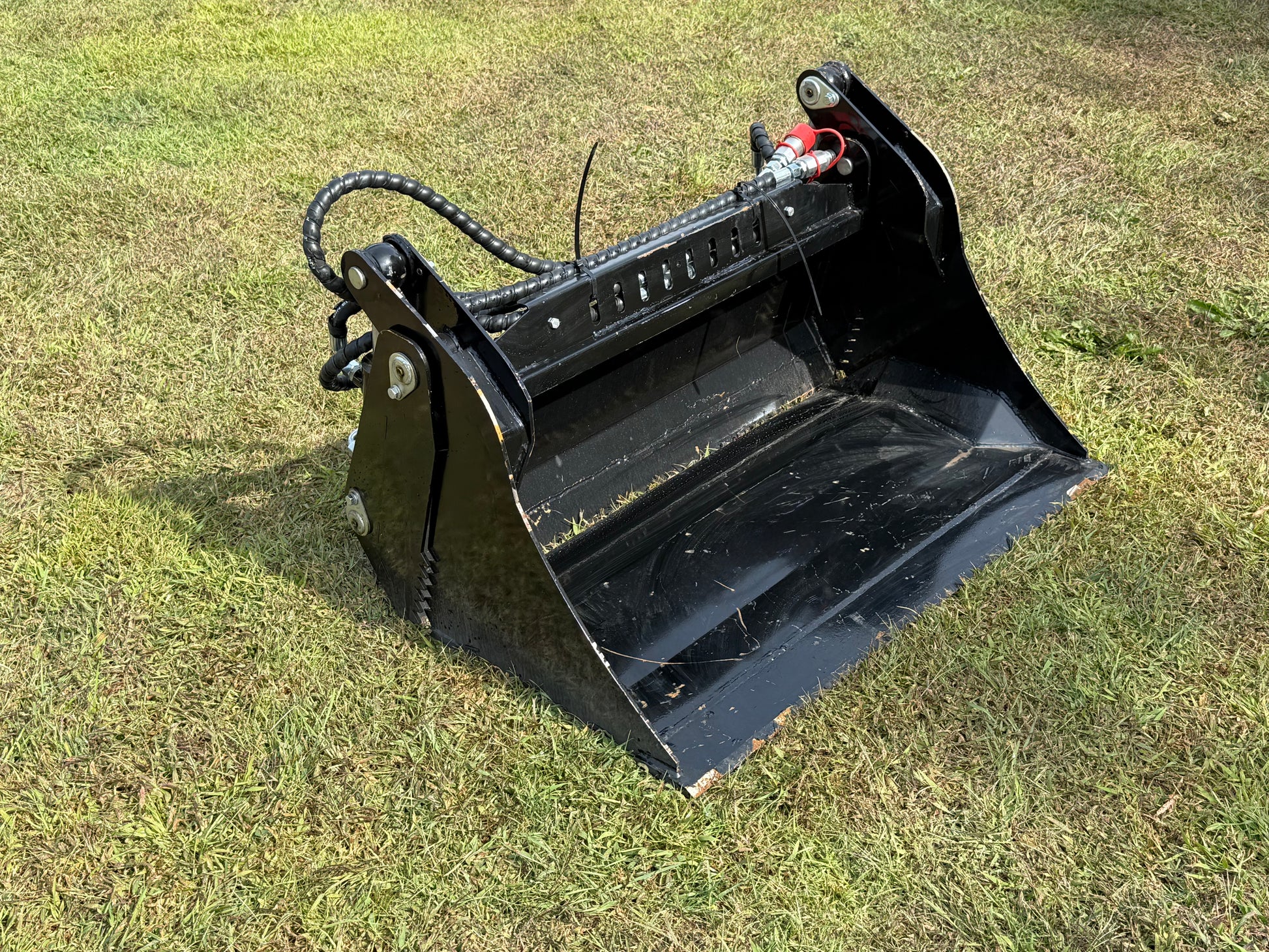 New, Unused 4 in 1 Combo Mini Skidsteer Bucket allows for Digging, Grading, Grappling, and Dozing.